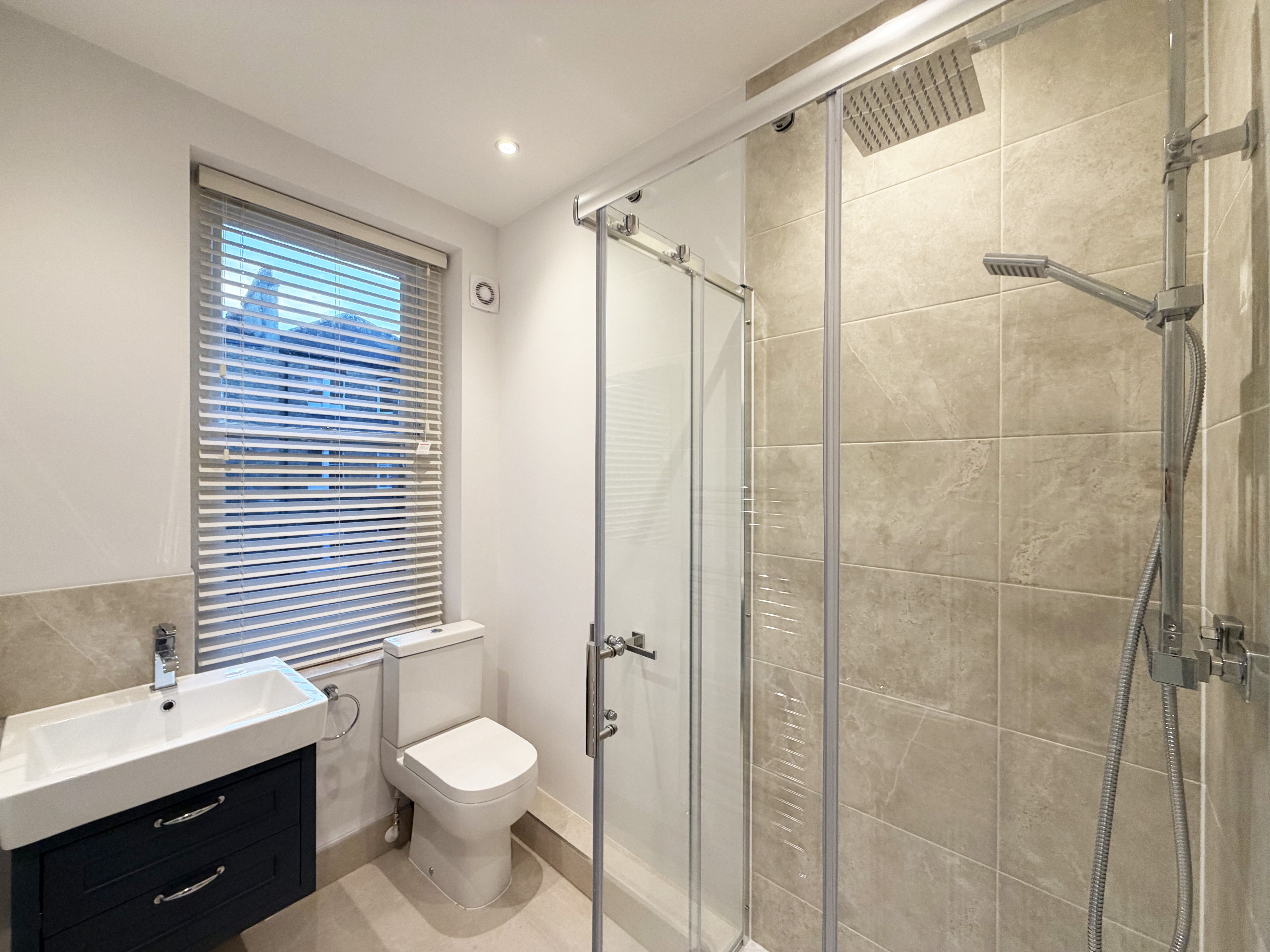 There are two generously sized double bedrooms. The main bedroom is conveniently located near a modern shower room, while the second bedroom is served by a separate family bathroom, making the layout particularly suitable for family living.
